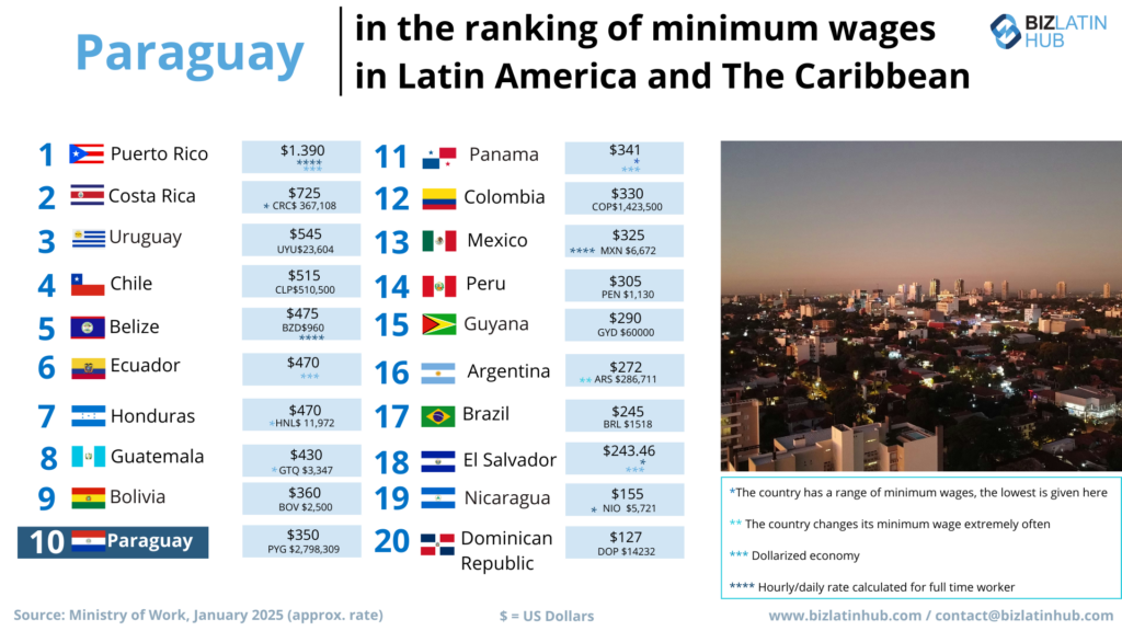 What is the minimum wage in Paraguay? | The current minimum wage as of January 2025 is Gs$2,798,309 (aprox USD$350). |