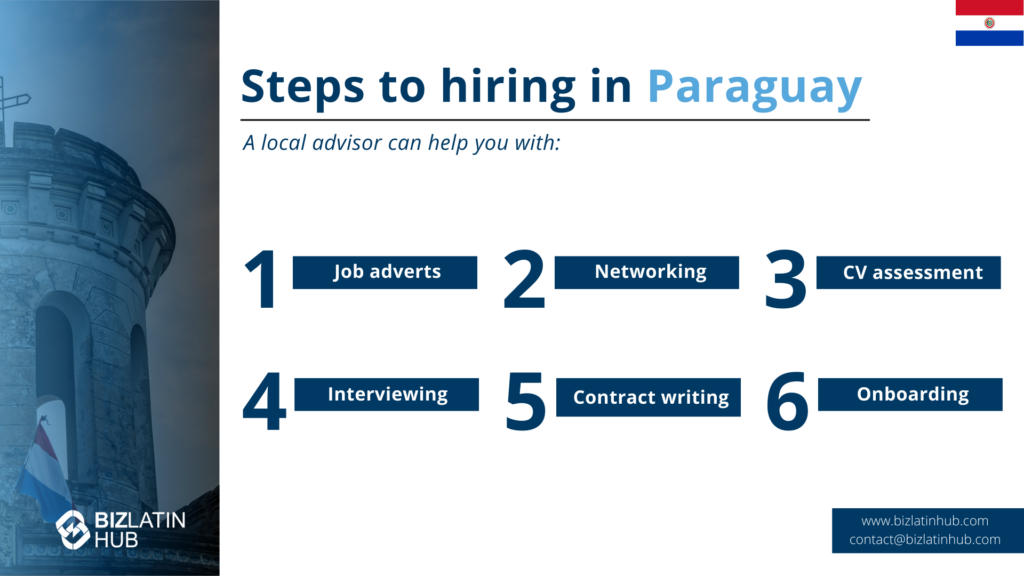 Steps to hiring in Paraguay | A local advisor can help you with: Job adverts Networking CV assessment Interviewing Contract writing Onboarding |
