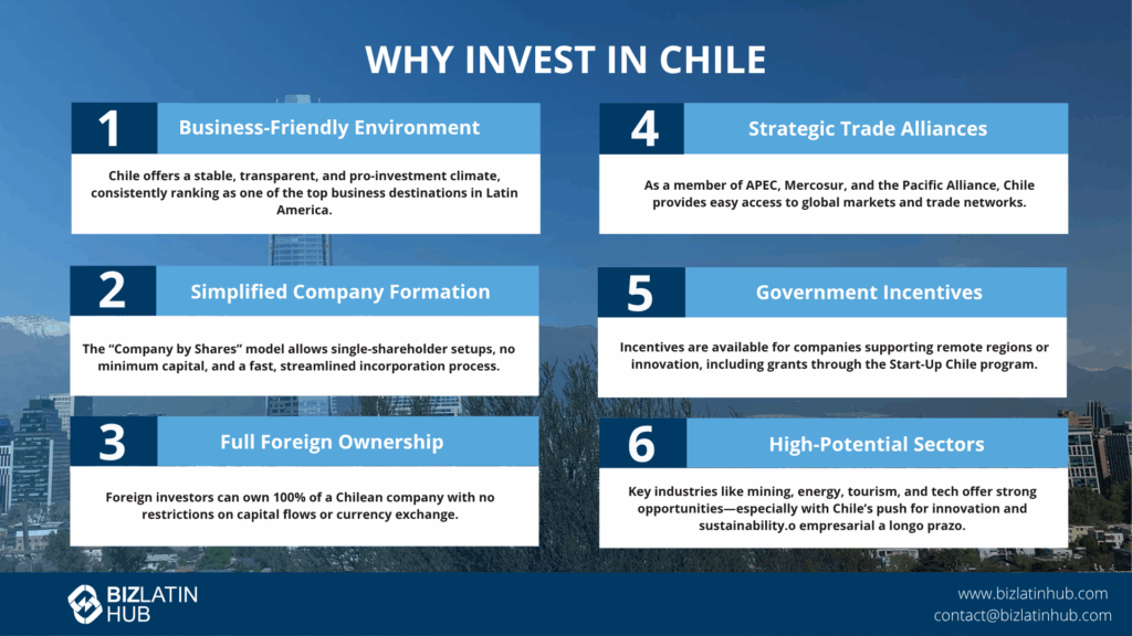 Additionally, Chile allows 100% foreign ownership and has no monetary controls on the movement of capital. These reasons make the registration of a Chilean company both attractive and accessible for foreign individuals or companies.