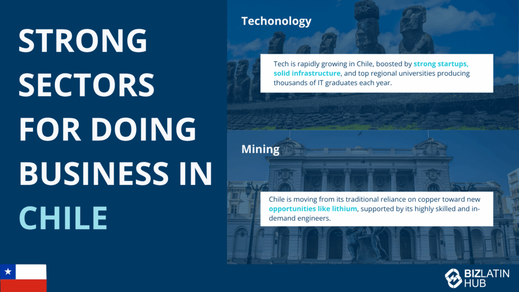 Most important sectors in Chile | The Chilean economy has long been based on primary resource extraction, with copper functioning as the bedrock. Tech is also important, while Chilean agriculture is world famous. |