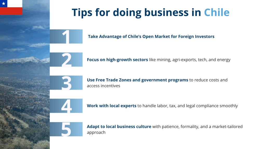 Over the last decades, numerous international companies have successfully undertaken the challenge of setting up a company in Chile, a country that is known for having the best business expansion opportunities in Latin America. Although Chile’s dynamic and developed market has been in the scope for multiple US companies, executives should be aware of the challenges they may face to prosper in the country. In this article, we review the principal challenges for US companies doing business in Chile and how to overcome them.