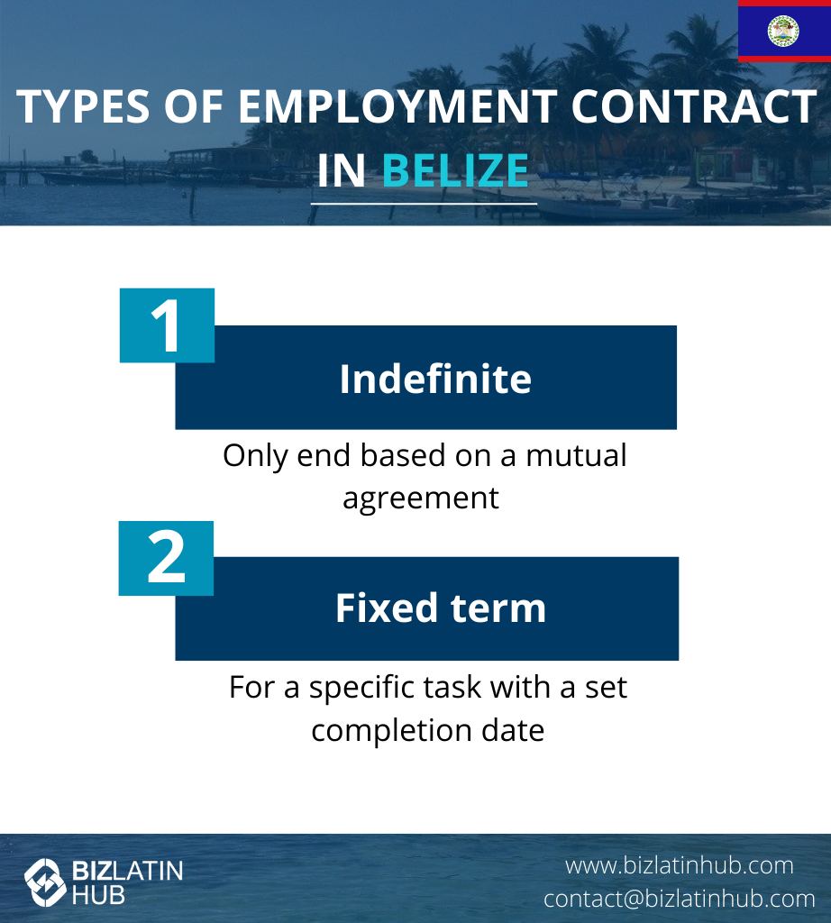 Types of Employment Contracts in Belize | Contracts come in two types: indefinite or fixed term. The latter must be clearly defined, for a specific reason and cannot generally be renewed. |