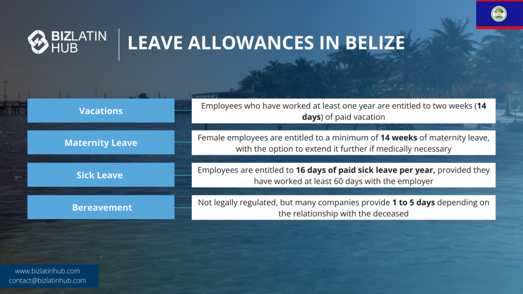 According to Belize’s labor laws, female employees are entitled to a minimum of 14 weeks of maternity leave, with the option to extend it further if medically necessary. Paternity leave is not mandatory under law in Belize. These provisions aim to promote work-life balance and gender equality in the workforce.
