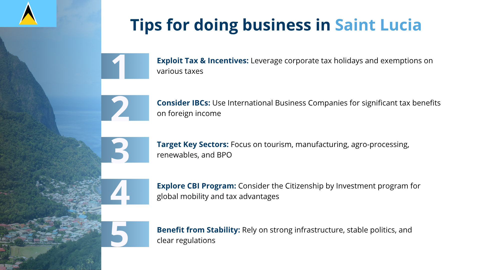 Businesses in St. Lucia benefit from no capital gains tax, no wealth or inheritance taxes, corporate tax holidays, and duty-free concessions. International companies also enjoy no withholding taxes on dividends, interest, or royalties for non-residents.