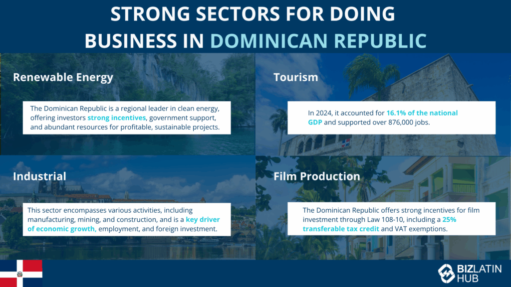 Most important sectors in the Dominican Republic | The country has a strong manufacturing and industrial sector, with services such as tourism and media also booming. Tech is also developing rapidly, thanks to investment in education. |