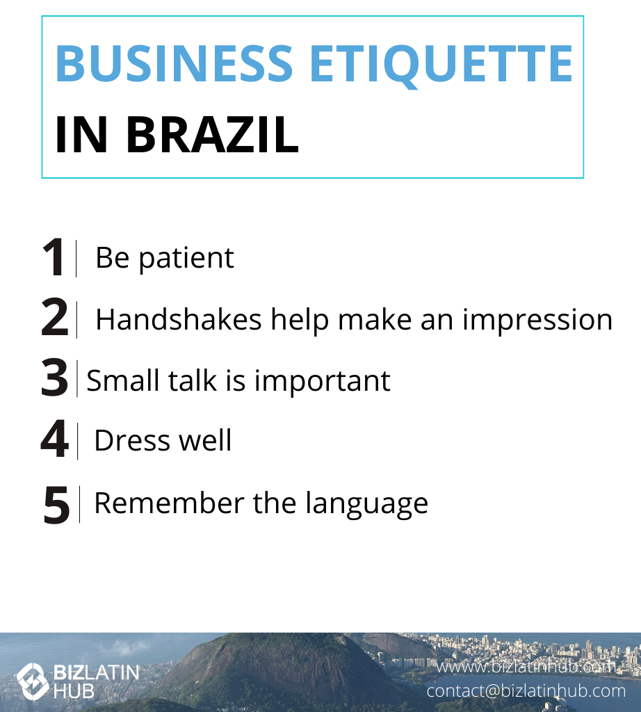 Is punctuality important when doing business in Brazil? | While some areas of the country might be more flexible with time than you are used to, this certainly isn’t the case everywhere. |