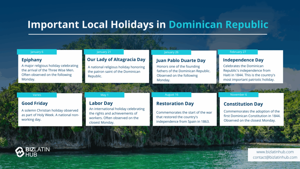 Punctuality in the Dominican Republic blends being on time with flexibility. While it’s courteous to arrive promptly at meetings, it’s common for them to start late. This reflects the cultural blend of valuing relationships and comfort. Openness to spontaneous changes is crucial. The vibrant social scene may lead to unexpected lunches or changes. Foreigners are expected to be on time despite the relaxed local attitude. Patience and calmness are necessary as delays are normal. Adapting to these nuances helps in navigating business engagements.