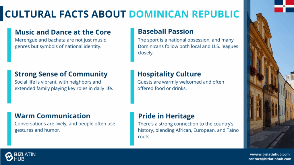 Professional communication in the Dominican Republic is typically formal and expressive. Use titles like Señor or Señora, and address people by their last names until invited otherwise. Face-to-face meetings are preferred, and small talk is essential before moving into business discussions. Indirect language and storytelling are common to preserve harmony.