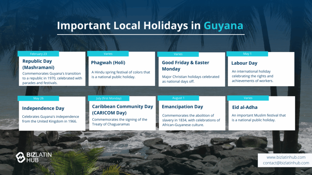 Guyana observes a rich array of statutory holidays. Businesses—especially government offices and banks—may close on these days: