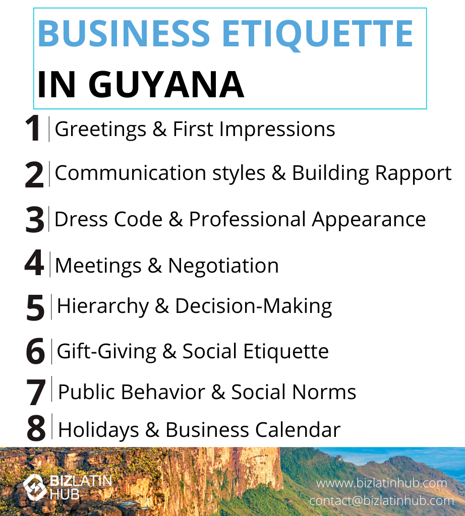 Understanding local customs can make—or break—your business interactions in Guyana. Navigating through local laws, corporate protocols, language nuances and cultural disparities can present challenges for foreign executives seeking to penetrate the Guyanese market. So if you are considering starting a business in Guyana, the following tips on business etiquette in Guyana should come in handy.
