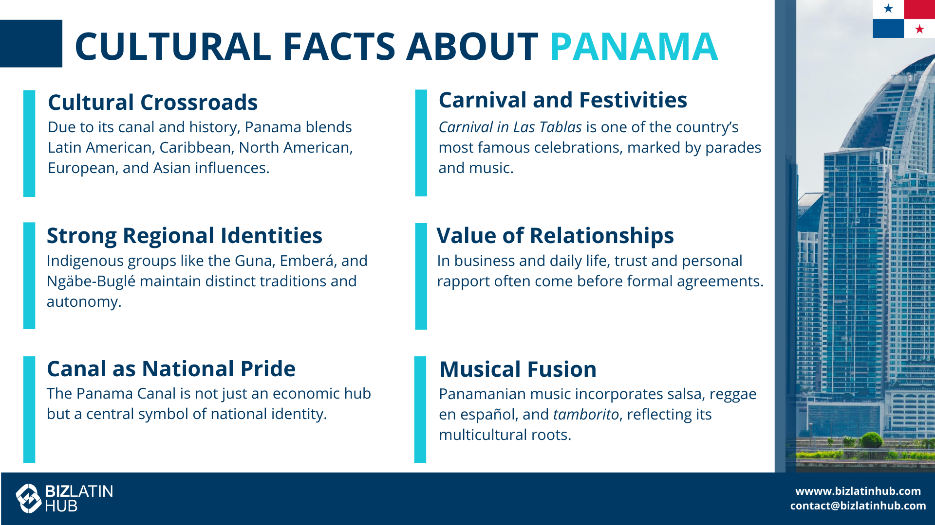 Biz Latin Hub’s operations in Panama City allow us to provide insider guidance on navigating local customs and professional practices.