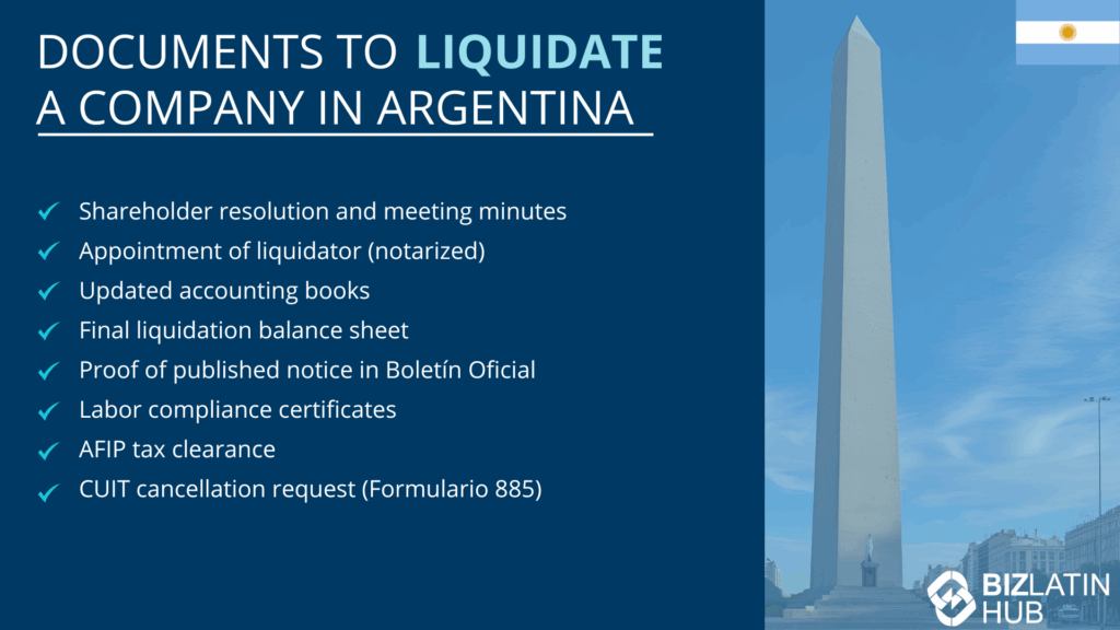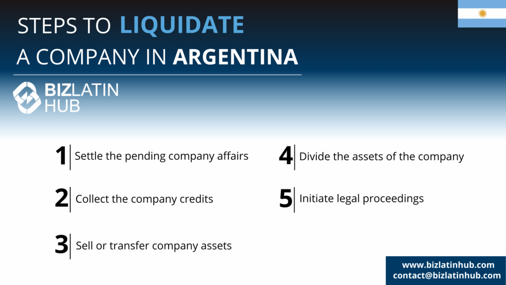 5 Steps to liquidate a company in Argentina | Shareholders’ Meeting. Appointment of Liquidator. Preparation of a final balance sheet. Settlement of all outstanding debts and obligations. Distribution of remaining assets among shareholders. |