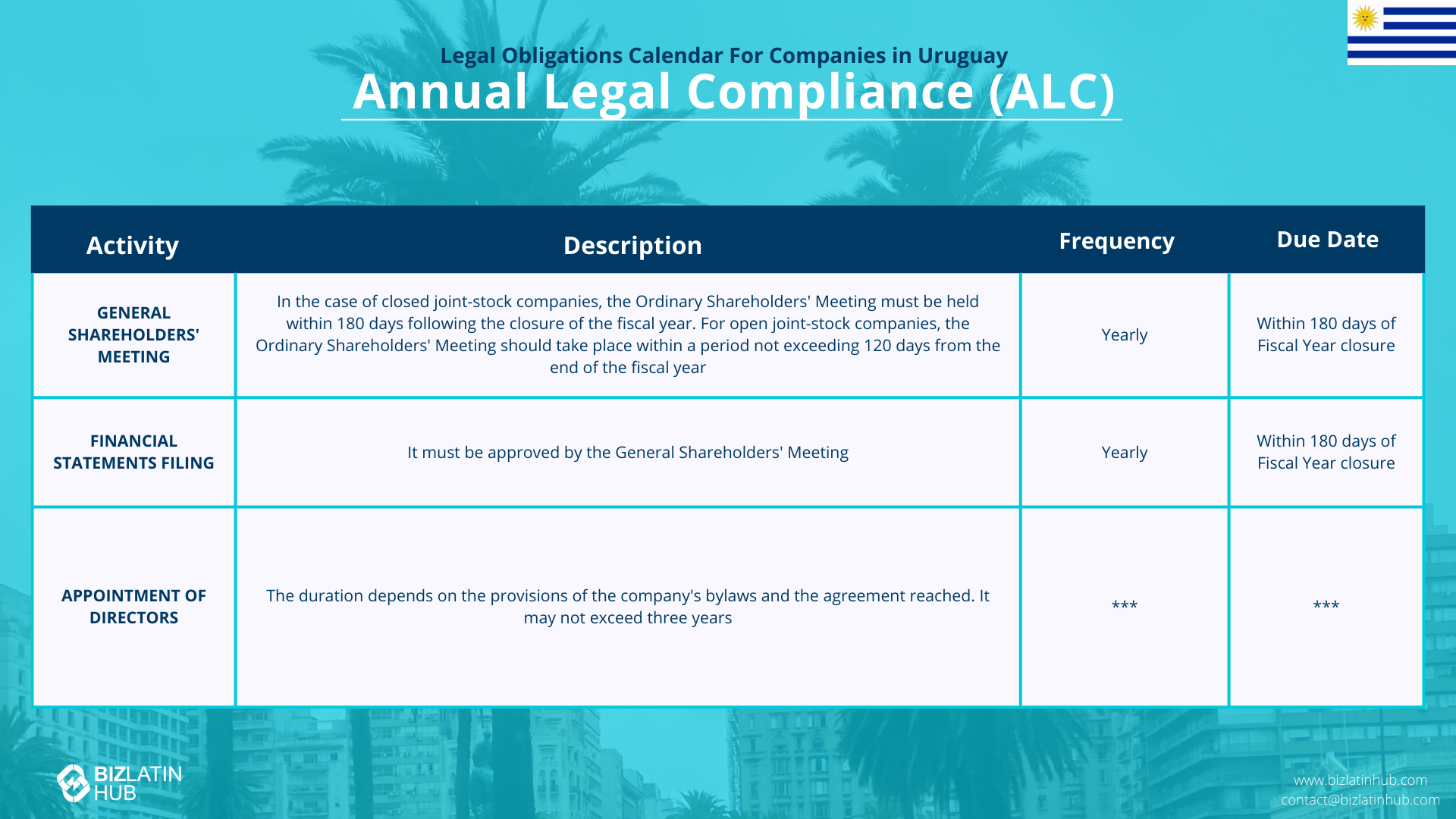 The following are requirements of running a company in the country. Together, they make a list of the key corporate compliance requirements in Uruguay.