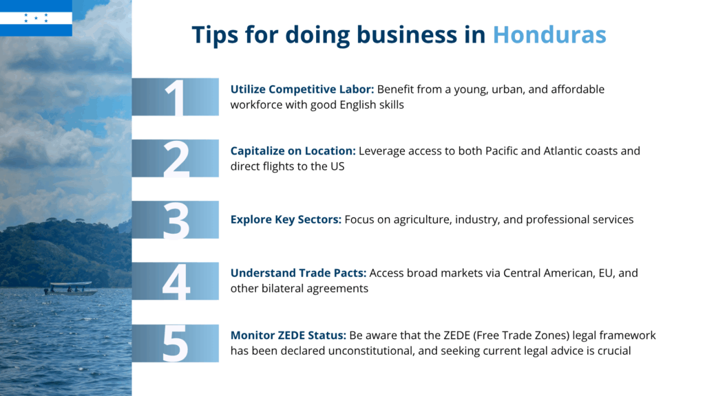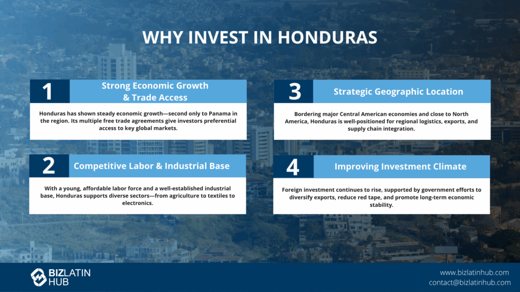 As a member of CAFTA-DR, Honduras benefits from preferential trade access to the United States, its largest trading partner. This makes it an ideal platform for exporting goods to the US market.