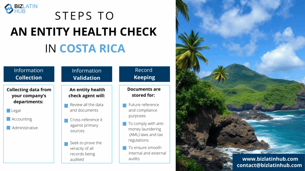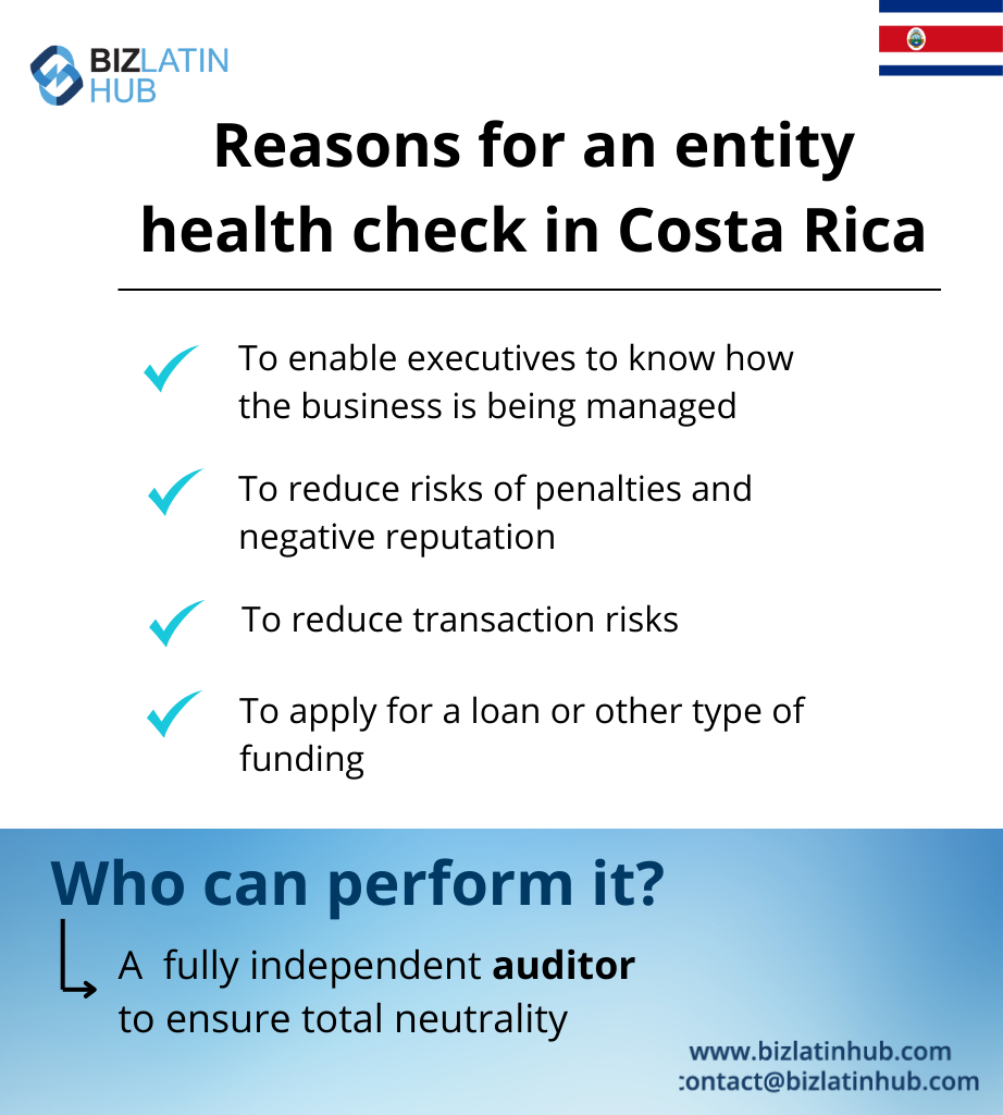 An entity health check in Costa Rica includes an exhaustive legal and accounting review to determine if a company complies with all local norms and regulations, and verify that accounting records are accurate. An entity health check can include the examination of different corporate documents such as tax returns, corporate filings, or operating licenses.