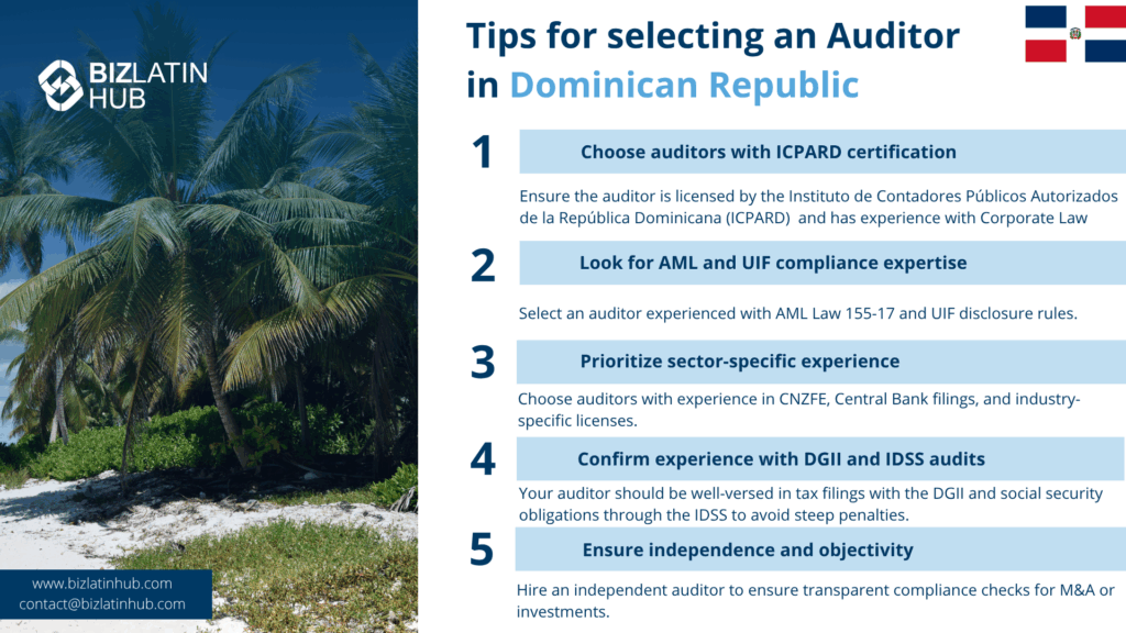 | What are the key areas reviewed for a Dominican company? | Key regulations include DGII tax filings, IDSS social security contributions, compliance with Dominican labor laws, anti-money laundering laws such as Law 155-17, and free zone operational rules under CNZFE. |