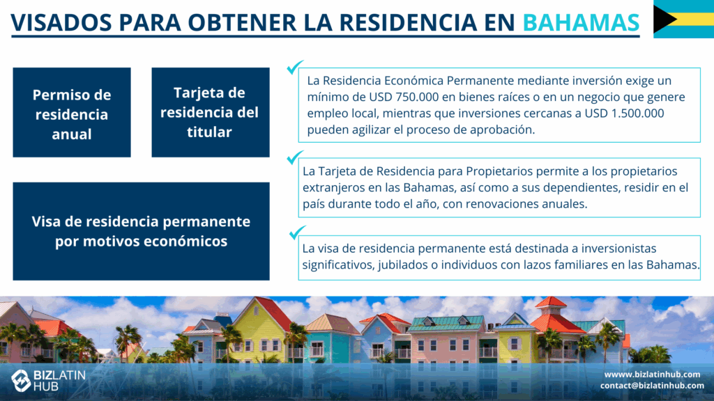 Este programa permite a los trabajadores a distancia y a los estudiantes residir en las Bahamas hasta un año. Los solicitantes deben demostrar autosuficiencia económica. H3: 2. Tarjeta de Residencia Anual de Propietario de Vivienda: Los extranjeros que posean propiedades residenciales en Bahamas pueden solicitar esta tarjeta anual, que les permite a ellos y a sus familiares residir en el país durante el periodo de validez de la tarjeta.