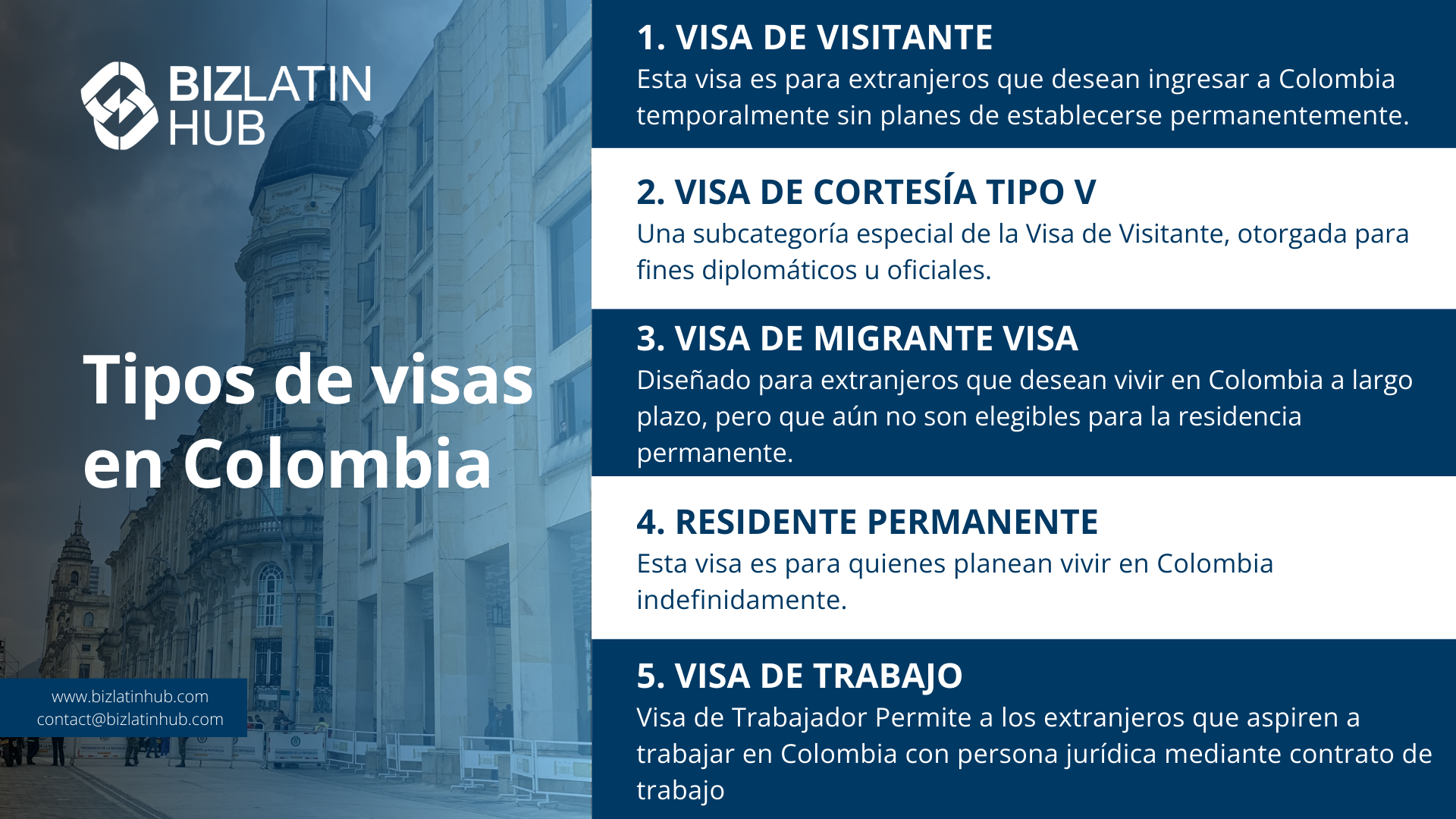 Si piensas trabajar, estudiar, jubilarte o constituir una empresa en Colombiaexisten categorías específicas de visados con las que debes familiarizarte. Los requisitos del visado de trabajo en Colombia pueden variar según el tipo de empleo y la duración de la estancia, por lo que es crucial reunir la documentación necesaria y cumplir los criterios específicos asociados a cada tipo de visado en Colombia. Esta guía ofrece una visión general de las principales categorías de visados y detalla los requisitos generales para los extranjeros que deseen trabajar en Colombia.