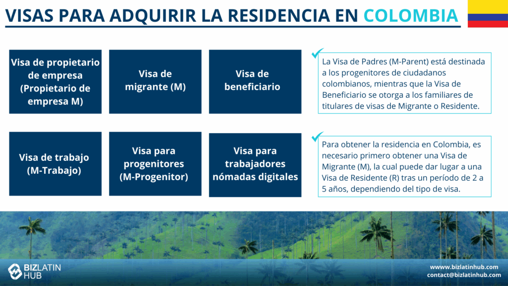 Finalidad: Para personas que han cumplido los requisitos para establecerse de forma permanente en Colombia. Suele obtenerse tras haber sido titular de un visado de tipo M durante varios años, o mediante una inversión significativa.