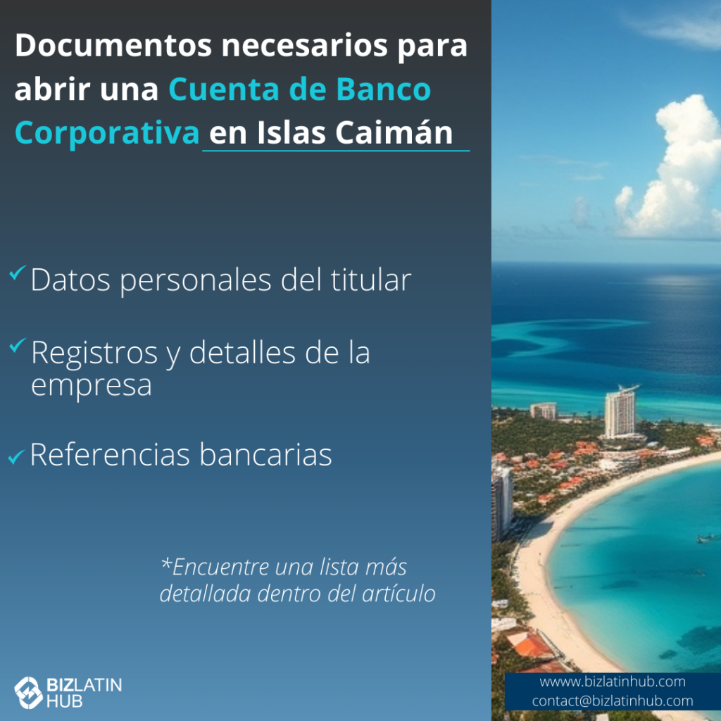 Nuestra recomendación: Para conocer con precisión los requisitos documentales adaptados a su caso concreto, es aconsejable consultar a un experto bancario local en las Islas Caimán.
