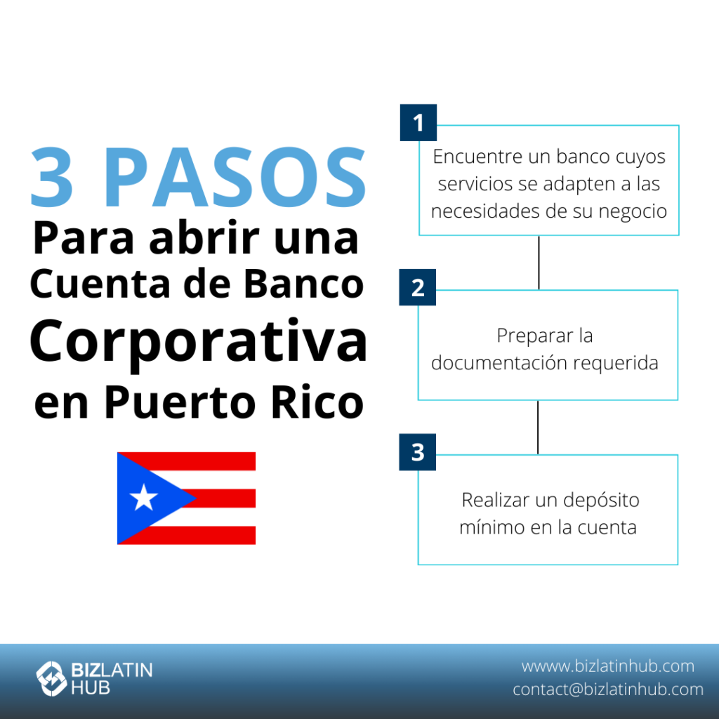 El proceso para abrir una cuenta bancaria corporativa en Puerto Rico: | Paso 1 – Busca un banco cuyos servicios se ajusten a las necesidades de tu empresa. Paso 2 – Prepara la documentación requerida. Paso 3 – Haz un ingreso mínimo en la cuenta. |