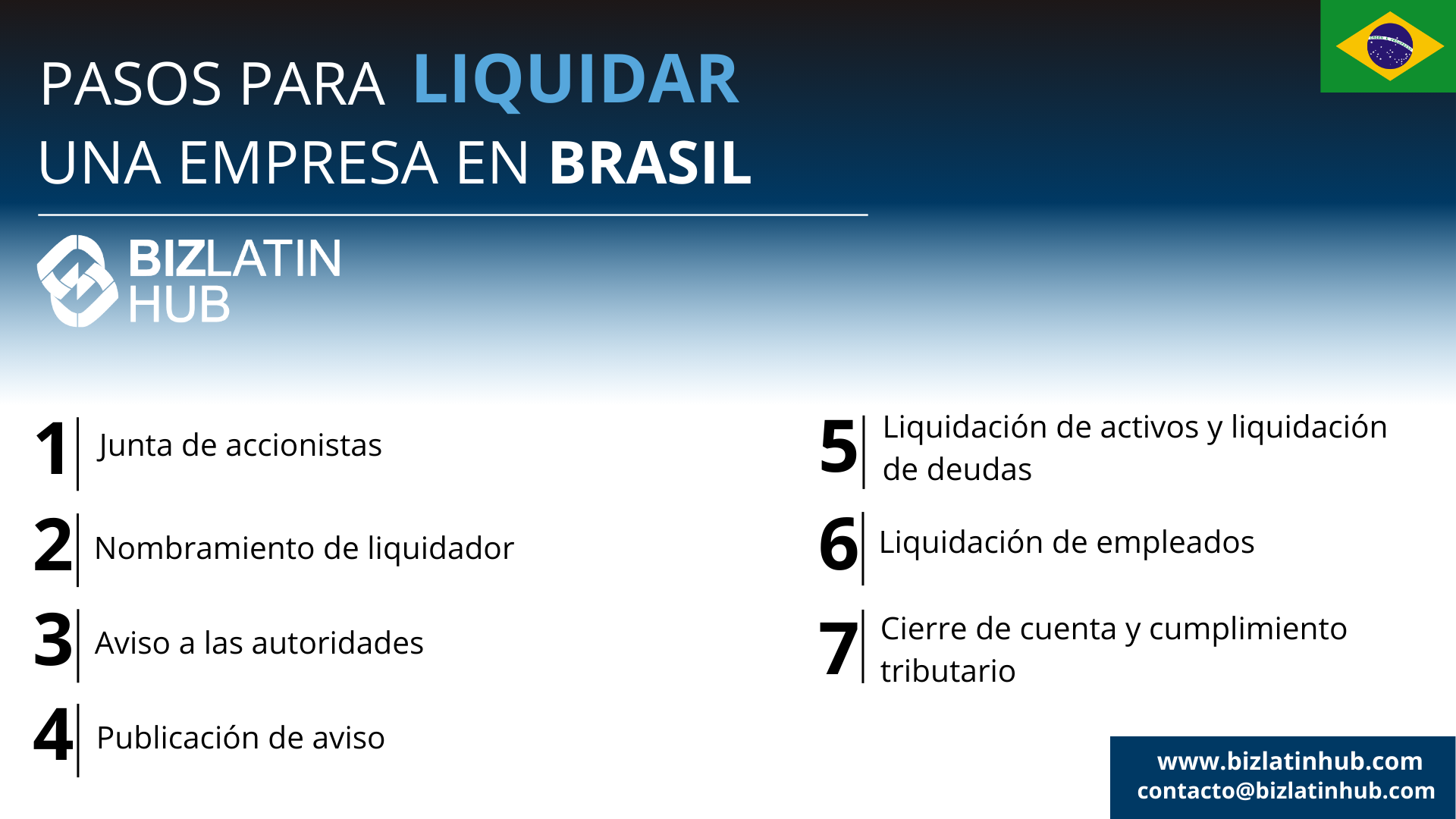 7 pasos para liquidar una empresa en Brasil | Junta de accionistas Nombramiento de liquidador Notificación a las autoridades Publicación de la notificación Liquidación de activos y liquidación de deudas Liquidación de empleados Cierre de cuentas y cumplimiento de obligaciones fiscales |
