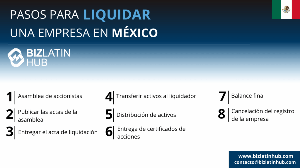 8 Pasos para liquidar una empresa en México | Paso 1 – Asamblea de accionistas Paso 2 – Publicación del acta de la asamblea Paso 3 – Entrega del acta de liquidación Paso 4 – Transferencia de activos al liquidador. Paso 5 – Distribución de activos Paso 6 – Entrega de certificados de acciones Paso 7 – Balance final Paso 8 – Cancelación del registro de la empresa |