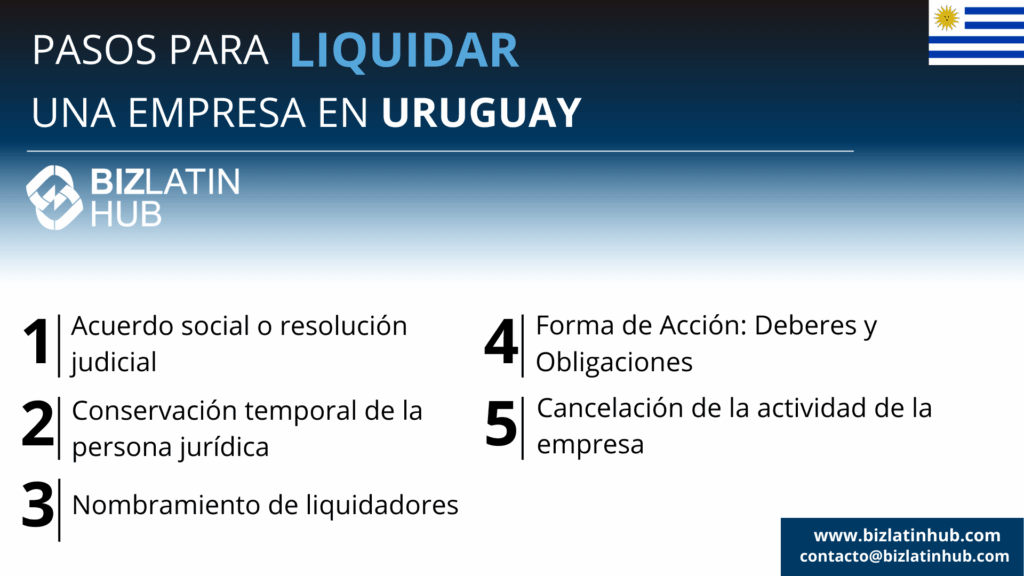 5 pasos para liquidar una empresa en Uruguay | 1. Acuerdo social o resolución judicial 2. Conservación temporal de la persona jurídica 3. Nombramiento de liquidadores 4. Forma de actuación: deberes y obligaciones 5. Cancelación de la actividad de la empresa con bajas fiscales y laborales |