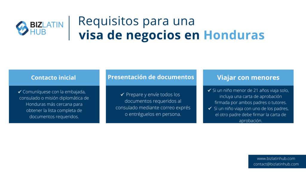 Las personas interesadas en obtener un visado de negocios deben consultar con la embajada o el consulado de Honduras en su país para conocer los detalles específicos. Esto les orientará sobre lo que es necesario para su solicitud de visado.