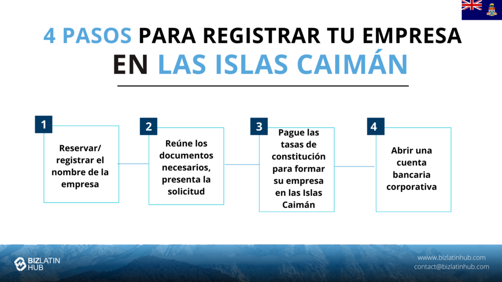 Pasos para constituir una empresa en las Islas Caimán: | Paso 1: Reserva/registra el nombre de la empresa. Paso 2: Reúne los documentos necesarios, presenta la solicitud. Paso 3: Paga las tasas de constitución para formar tu empresa en las Islas Caimán. Paso 4: Abre una cuenta bancaria corporativa. |