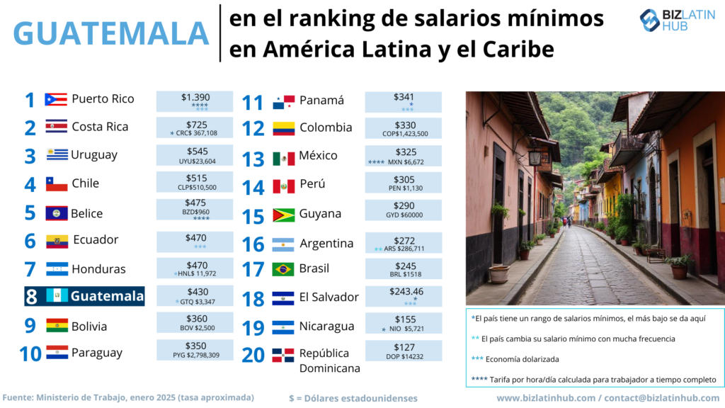 Guatemala tiene salarios mínimos específicos, según el sector. El salario mínimo oscila entre 3.062,63 y 3.416,38 GTQ al mes.