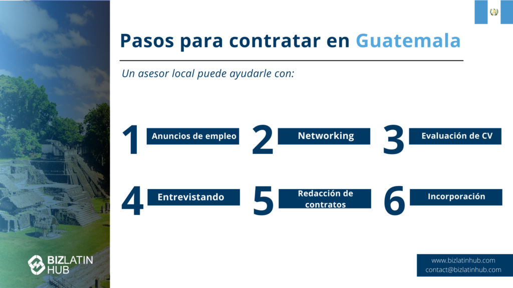 Contratar y gestionar eficazmente a los empleados es fundamental para el éxito empresarial. Guatemala ofrece un panorama laboral único que combina tanto oportunidades como retos para los empresarios que navegan por este mercado o están considerando crear una empresa en Guatemala. Comprender este entorno es esencial para una gestión eficaz de la mano de obra. Las empresas que deseen contratar empleados en Guatemala deben tener en cuenta las normas de cumplimiento, las obligaciones de la legislación laboral y la disponibilidad de mano de obra.