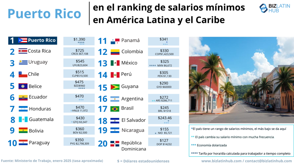 En Puerto Rico, la estructura salarial se rige por una serie de leyes y reglamentos. El salario mínimo actual es de 10,50 $ por hora, aplicable a todos los sectores. Este salario es superior al salario mínimo federal de 7,25 $ por hora. Los empresarios con más de 20 empleados deben pagar una prima obligatoria, que es el 2% del salario anual del empleado, con un tope de 600 $ si trabajan al menos 1.350 horas en un año fiscal.