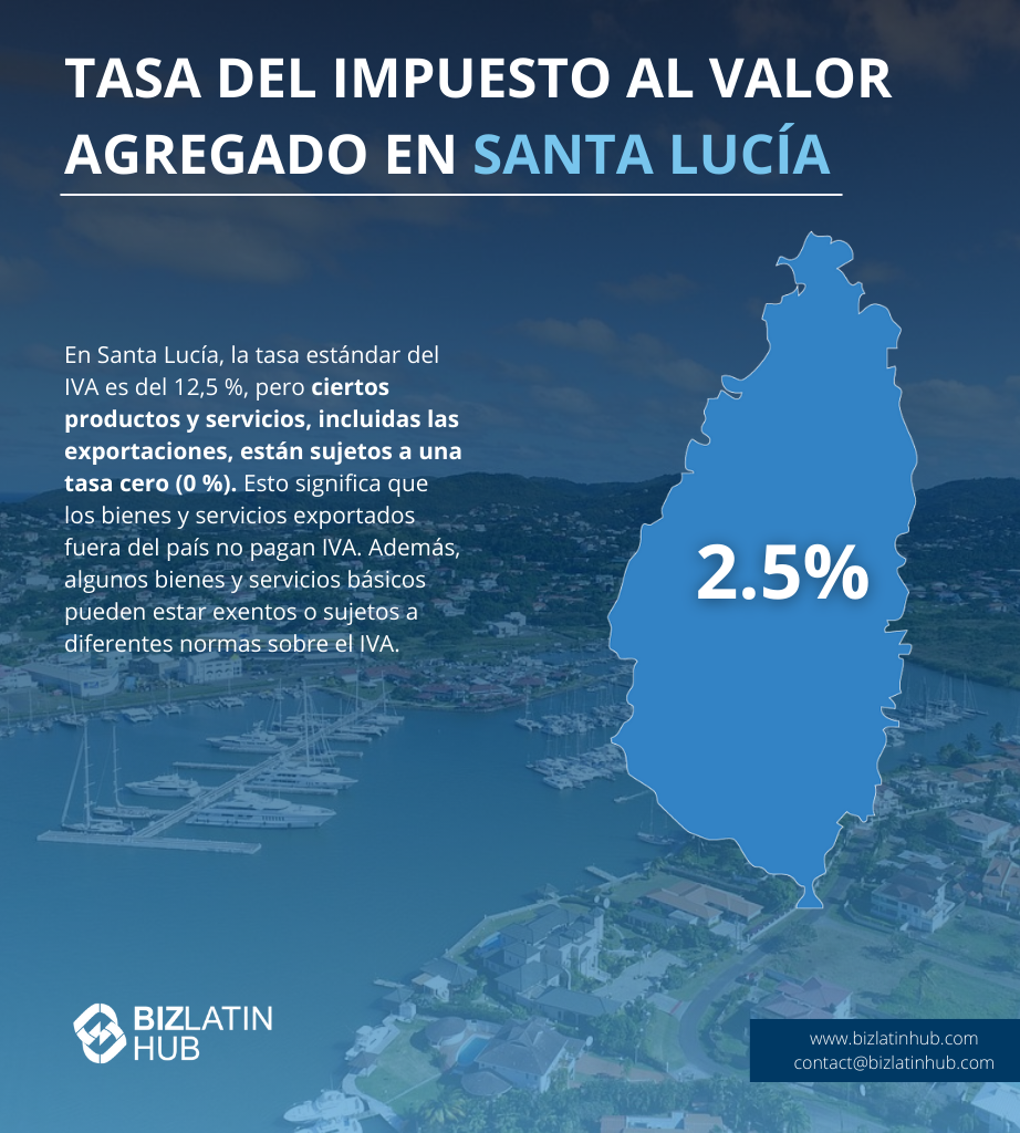 ¿Cuál es el tipo del Impuesto sobre el Valor Añadido en Santa Lucía? | El tipo normal del IVA se sitúa en el 12,5%, y determinados bienes y servicios pueden estar sujetos a un tipo del 0%. En particular, el sector hotelero y los servicios asociados están sujetos a un tipo del 10%, mientras que desde el 1 de diciembre de 2020 está en vigor un tipo reducido del 7% para los servicios de alojamiento turístico. |