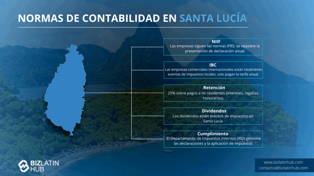 Santa Lucía se adhiere a las normas contables mundialmente reconocidas, concretamente a las Normas Internacionales de Información Financiera (NIIF), lo que garantiza un alto nivel de transparencia financiera y coherencia con las prácticas internacionales.