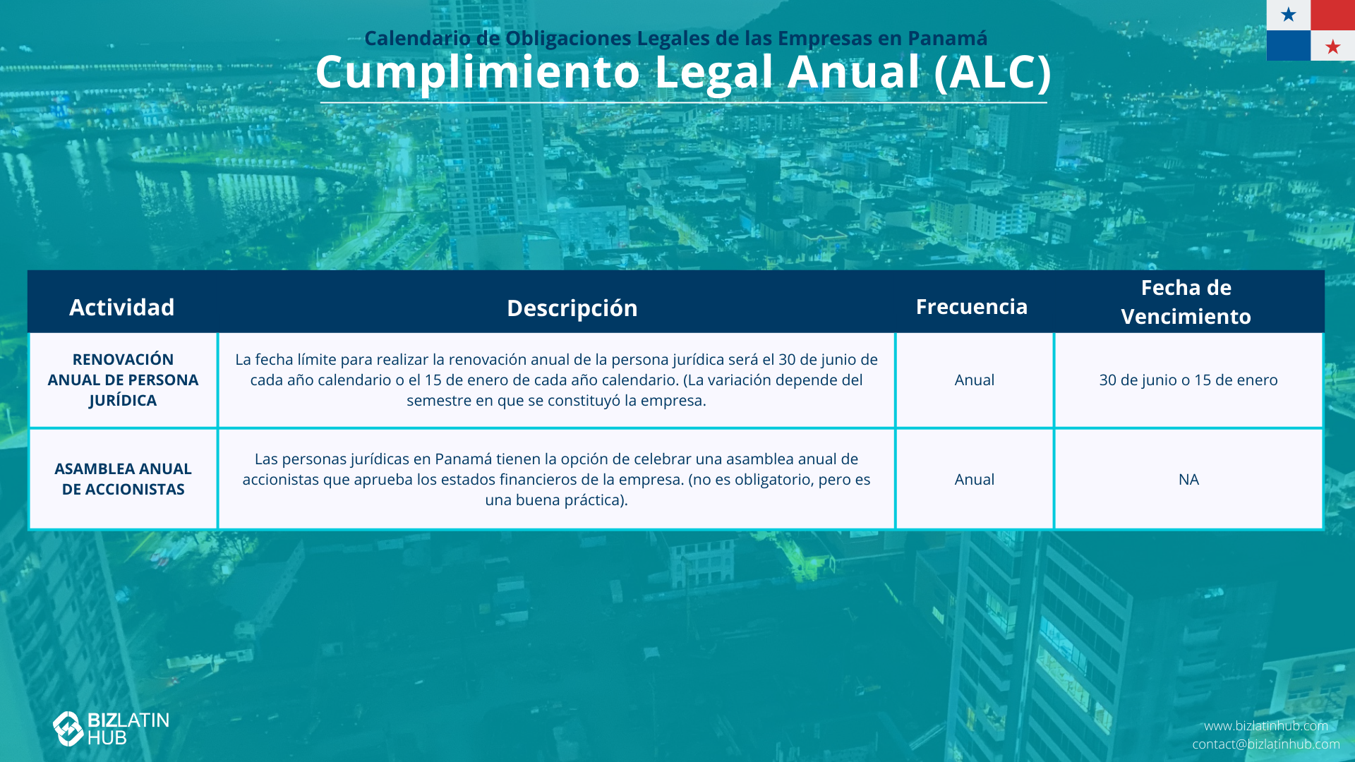 ¿Cuáles son los requisitos anuales de cumplimiento legal de la Entidad? | La fecha límite para que las empresas realicen la renovación anual de su personalidad jurídica en Panamá es el 30 de junio o el 15 de enero de cada año natural. Esto depende del semestre en que se constituyó la sociedad. Las personas jurídicas en Panamá tienen la opción de celebrar una junta anual de accionistas que apruebe los estados financieros de la empresa. No es obligatorio, pero es una buena práctica. |