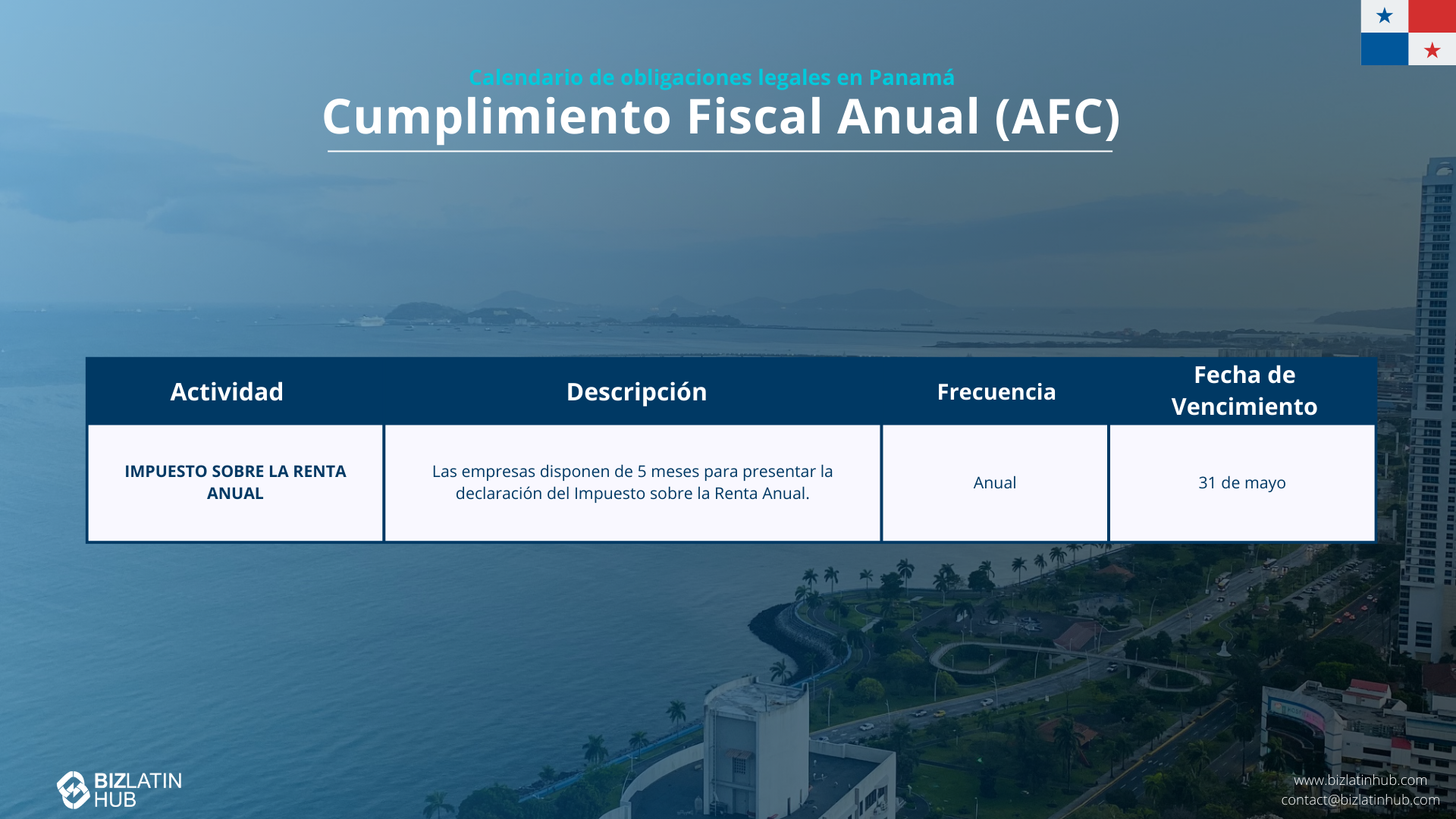 ¿Cuáles son los requisitos anuales de cumplimiento fiscal de la entidad? | Las empresas en Panamá tienen 5 meses para presentar su declaración anual del impuesto sobre la renta, que debe hacerse antes de la fecha límite del 31 de mayo. |