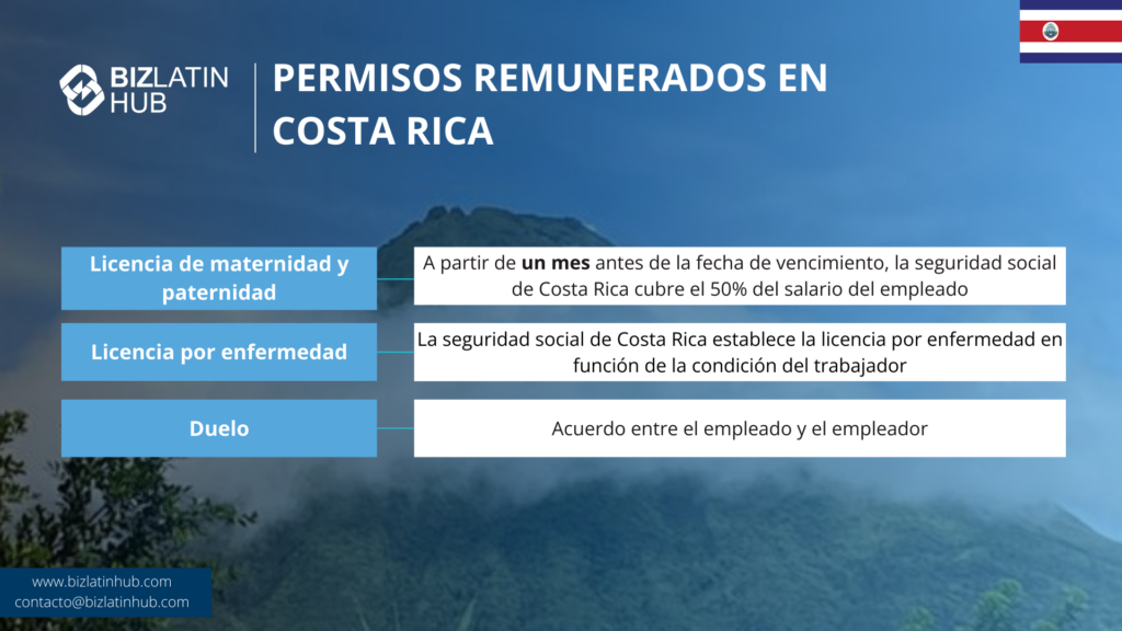 3. Luto: Según la legislación laboral de Costa Rica, no existe ninguna estipulación con respecto a la licencia por luto, que debe ser negociada y acordada entre el empleado y el empleador.