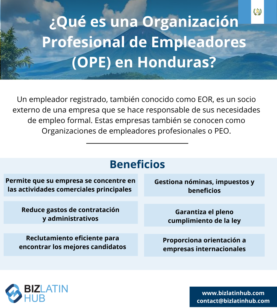 Un Employer of Record (EOR) en Honduras también puede conocerse como organización profesional de empleadores (OEP), y uno de los servicios más comunes que prestan es la externalización de nóminas. La externalización de las nóminas en Honduras implica que la EOR sólo gestiona las nóminas del personal, lo que significa que mantendrás el control total sobre sus horarios y obligaciones, evitando al mismo tiempo la necesidad de pasar por la constitución de una empresa en Honduras. Biz Latin Hub puede ayudarte con todo esto, así como con la formación de empresas en el futuro si así lo deseas.