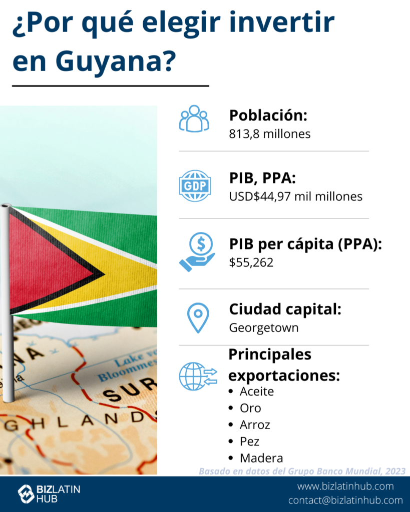 Estas cifras ponen de relieve el rápido desarrollo económico de Guyana, que la convierte en un destino atractivo para los inversores internacionales. Con un panorama sociopolítico estable, ahora es el momento de aprovechar el crecimiento sin precedentes y encontrar las oportunidades de negocio en Guyana que ayuden a tu estrategia empresarial.