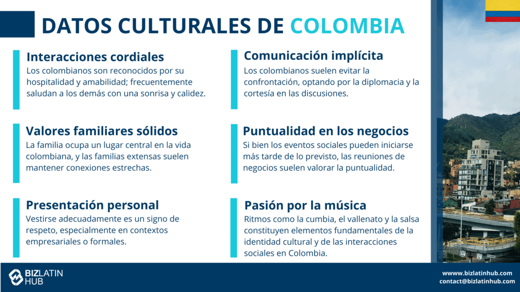 La cultura empresarial colombiana hace hincapié en la formalidad, la confianza y la diplomacia. Es esencial establecer relaciones personales antes de proceder a acuerdos formales. Los profesionales son corteses y prefieren una comunicación clara pero con tacto.
