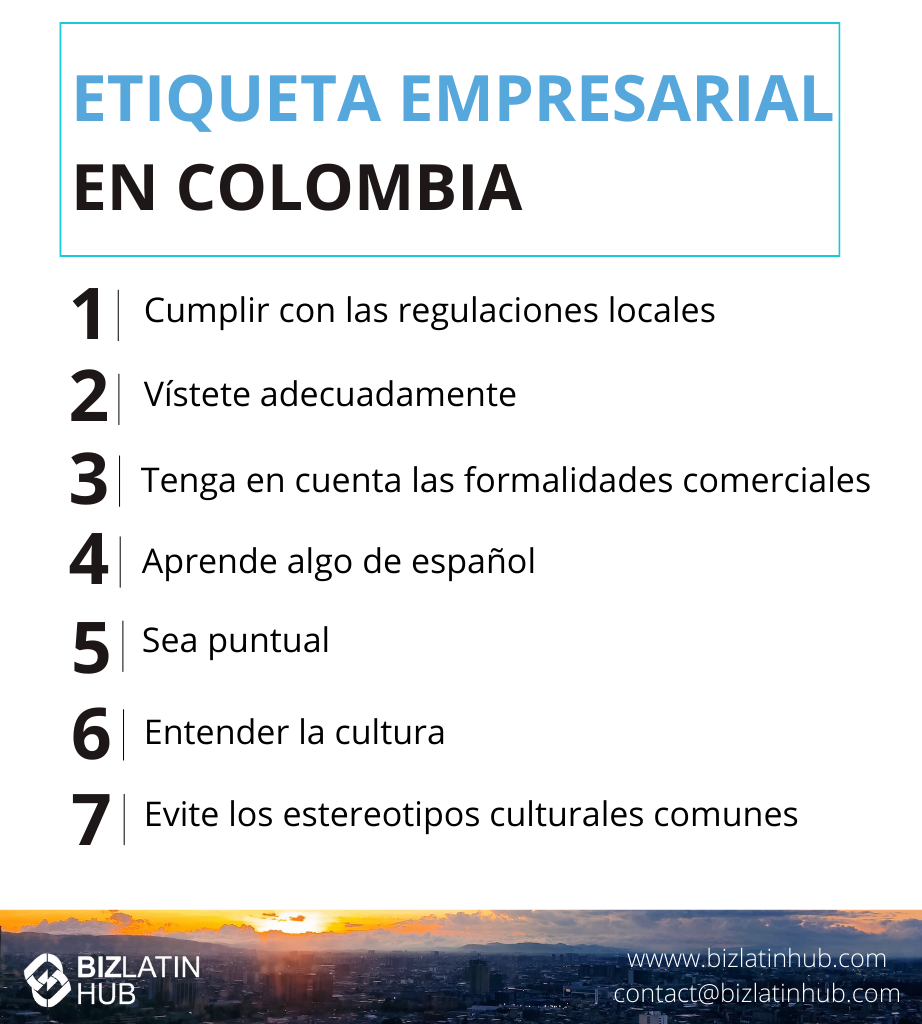 Comprender la etiqueta empresarial en Colombia es primordial para el éxito de tus esfuerzos empresariales en una de las economías más vibrantes y prometedoras de América Latina. Navegar a través de las leyes locales, los protocolos corporativos, los matices lingüísticos y las disparidades culturales puede suponer un reto para los ejecutivos extranjeros que pretenden penetrar en el mercado colombiano. Así que si estás pensando en abrir un negocio en Colombialos siete consejos siguientes sobre el protocolo empresarial en Colombia te resultarán útiles.