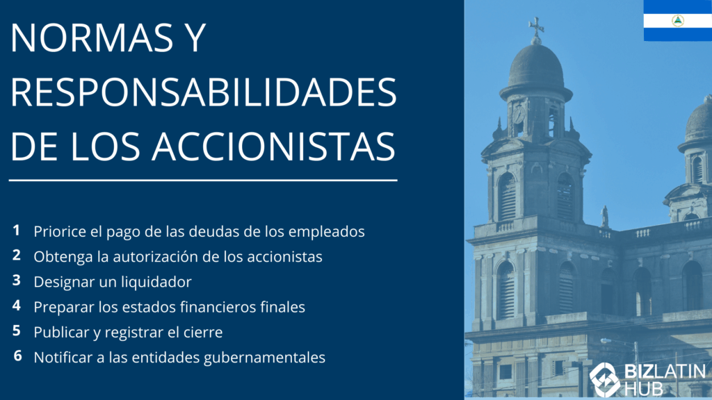 ¿Cuáles son las principales responsabilidades de un liquidador en Nicaragua? | El liquidador designado es responsable de vender los activos de la empresa, pagar a todos sus acreedores y, a continuación, distribuir los fondos restantes entre los accionistas. |