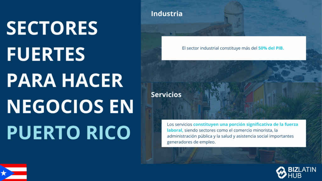 Sectores más importantes en Puerto Rico | La industria representa más del 50% del PIB, mientras que el sector servicios constituye la mayor parte del resto. Los productos farmacéuticos, los equipos médicos, los ordenadores y las prendas de vestir son algunos de los principales bienes de exportación producidos en Puerto Rico, junto con el pescado y el ron. |