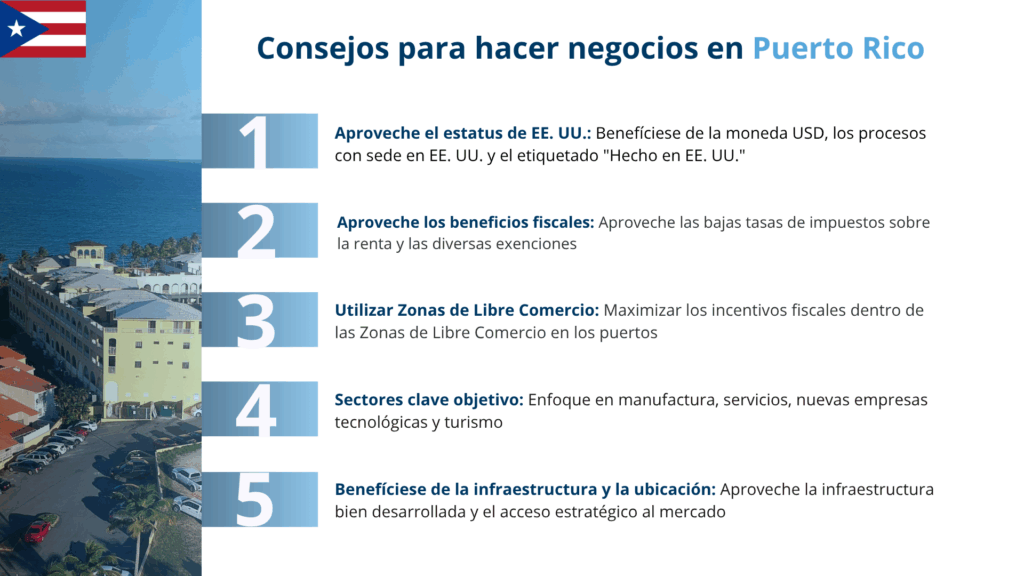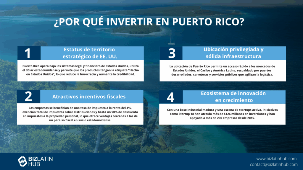 Hacer negocios en Puerto Rico conlleva una serie de ventajas fiscales que lo hacen atractivo para los inversores, como un tipo del 4% en el impuesto sobre la renta, una exención fiscal del 100% sobre las distribuciones de ganancias y beneficios, y una exención del 90% de los impuestos sobre bienes personales para algunos tipos de empresas.