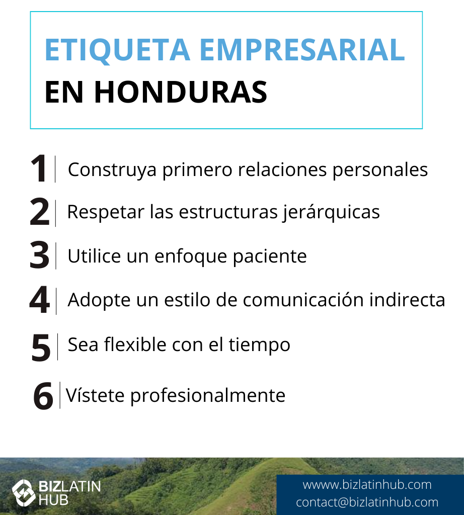 La cultura empresarial hondureña valora la paciencia. Las negociaciones son más lentas y se centran mucho en las relaciones. Respeta las formalidades utilizando los títulos y saludos adecuados para mejorar la eficacia de la comunicación.