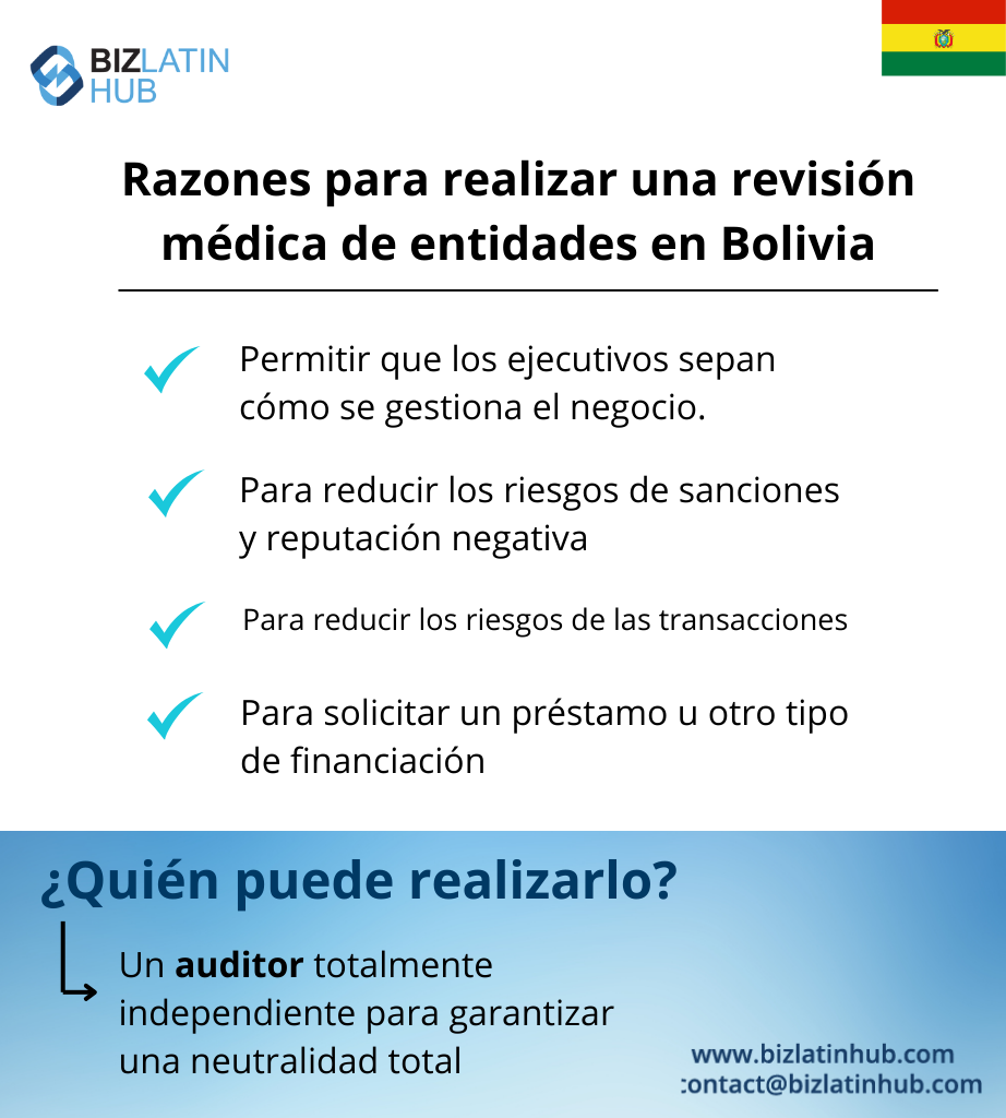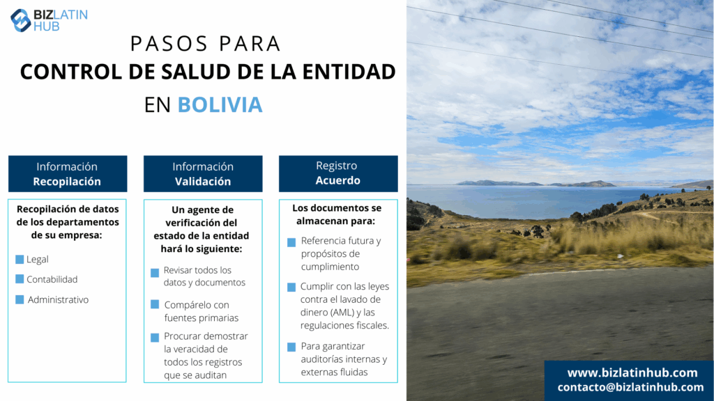 Un chequeo de la salud de la entidad es una auditoría llevada a cabo por un tercero para verificar su cumplimiento corporativo local. Un chequeo de la salud de la entidad en Bolivia implica la verificación de que los administradores y empleados de la empresa cumplen las obligaciones legales y fiscales.