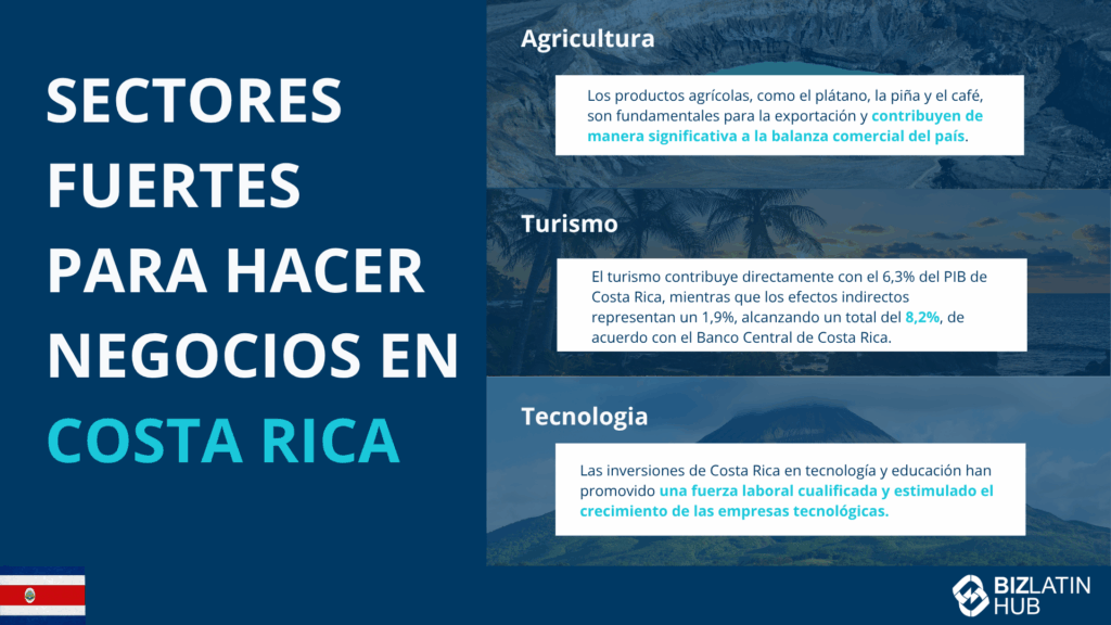 Para las empresas que hacen negocios en Costa Rica, los principales sectores son el ecoturismo, el desarrollo de software, los dispositivos médicos, los servicios compartidos y la agricultura sostenible.
