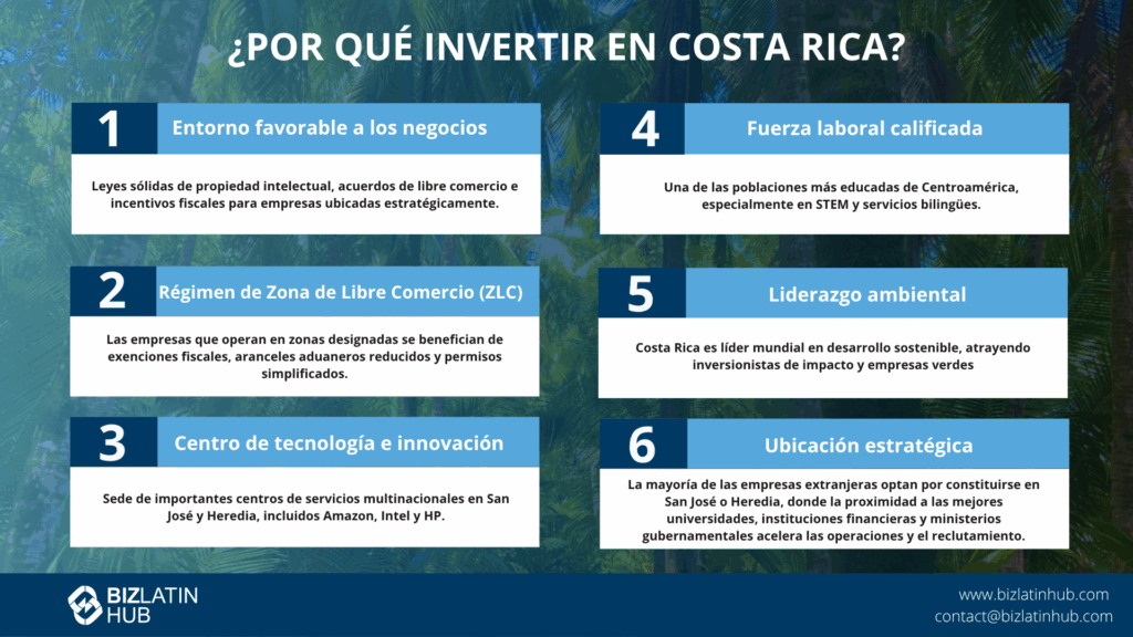Costa Rica se ha ganado la reputación de ser uno de los países latinoamericanos más atractivos para la inversión extranjera directa. Su estabilidad política, sus políticas medioambientales progresistas y su sistema jurídico favorable a los negocios lo convierten en un destino ideal tanto para empresarios como para multinacionales.