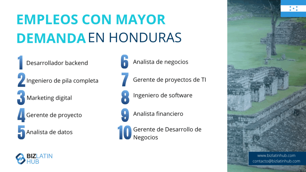 Los empresarios deben asegurarse de que el 90% de su plantilla son empleados locales hondureños. Se aplican excepciones si los contratados internacionales tienen habilidades únicas que no se encuentran localmente. Las leyes hondureñas prohíben la discriminación por motivos de raza, religión, política o situación económica. Ten en cuenta estas normas a la hora de contratar.